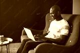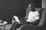 Young African entrepreneur sitting on a sofa working online