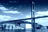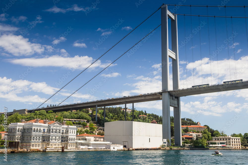 View of the First Bosporus Bridge. Ships passing through bridge connecting Europe and Asia. Sunny day with background of cloudy blue sky. Istanbul. Turkey.