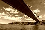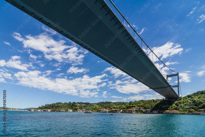 View of Fatih Sultan Mehmet Bridge which is localed on Bosphorus strait . Ships passing through bridge connecting Europe and Asia. Sunny day with background of cloudy blue sky. Istanbul. Turkey.