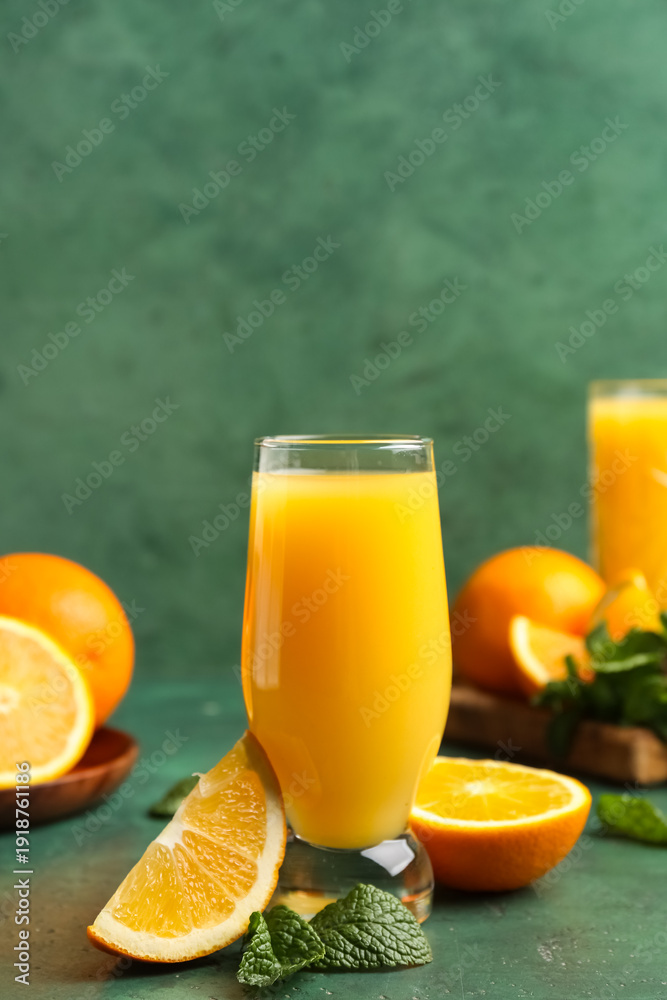 Glass of tasty juice with oranges and mint leaves on green grunge background