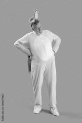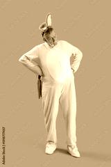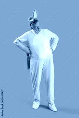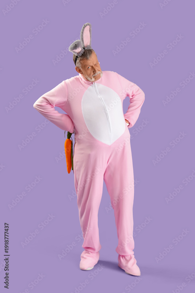Senior man in Easter bunny costume with plush carrot on lilac background