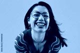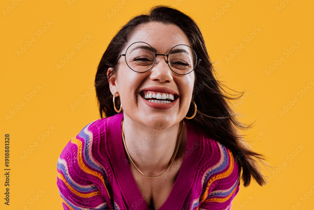 Happy young woman wearing glasses smiling against yellow background