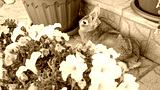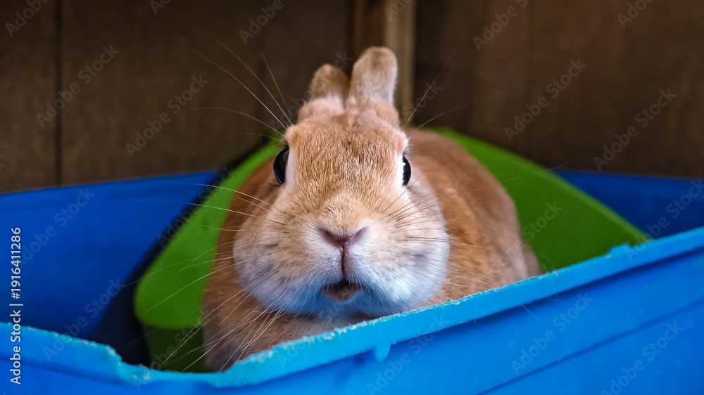 A beige decorative rabbit hids lying among flowers. Cute Easter Bunny resting outdoor. Adorable pet on a walk in a country house. Domestic animal. High quality photo.