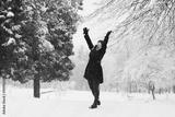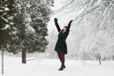 Young caucasian blonde girl in black coat and red knitted scarf walks in winter park