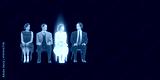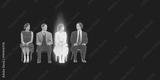 Four vintage people sitting on chairs on dark black background, central woman glowing pink with vertical light streaks while others remain black and white. Surreal contrast. Conceptual art.