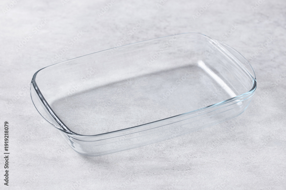 Clear rectangular glass baking pan, sleek kitchen tool, ideal for roasting, simple elegance, food styling mockup. Light grey background. Close up.