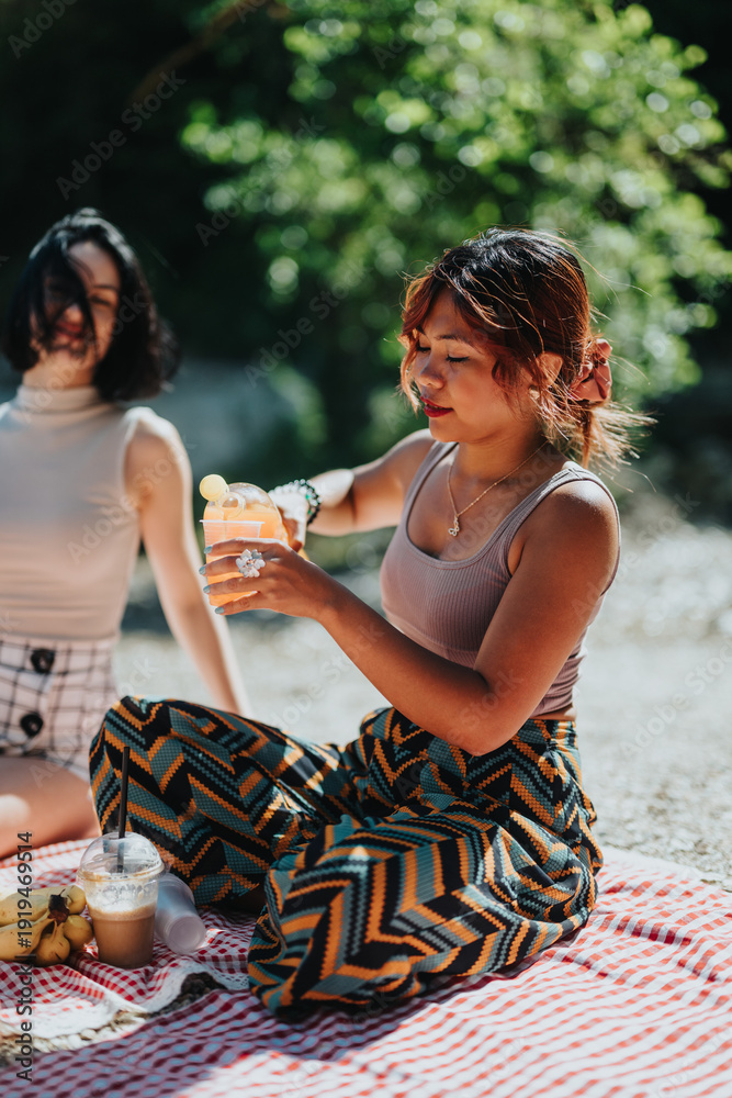 Two young women sit on a checkered blanket by a sunny river, sharing drinks and smiles. One pours a drink for a friend as the other relaxes, enjoying a warm outdoor picnic.