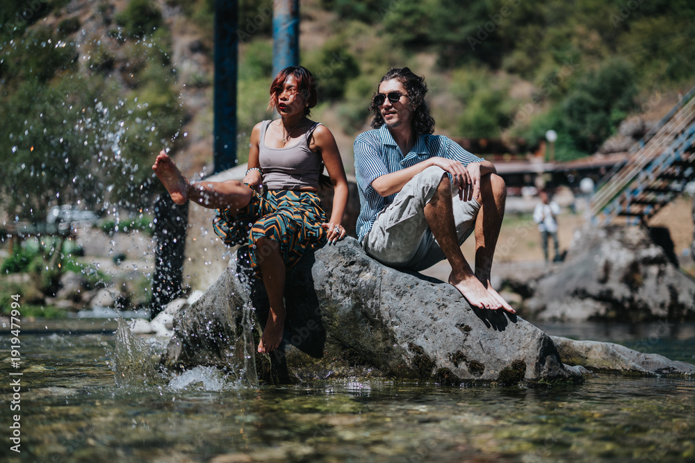 Two friends sit on a large rock in a shallow river, barefoot and relaxed. Sunny outdoor scene captures a casual, playful moment by the water.