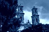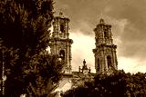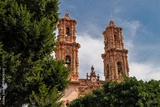 Ornate twin bell towers of Santa Prisca church with baroque carvings and statues partially obscured by green trees under clear sky