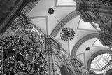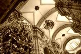 Baroque altar with gilded sculptures of saints, cherubs and religious figures under vaulted arches with chandeliers and ornate carvings inside Santa Prisca church in Taxco historic center