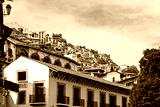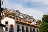 Panoramic hillside view of Taxco with colonial white facades, red tiled roofs, balconies and arched windows cascading down the slope in the historic center