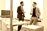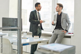 Full length portrait of two young business people chatting during coffee break, one of them Middle-Eastern