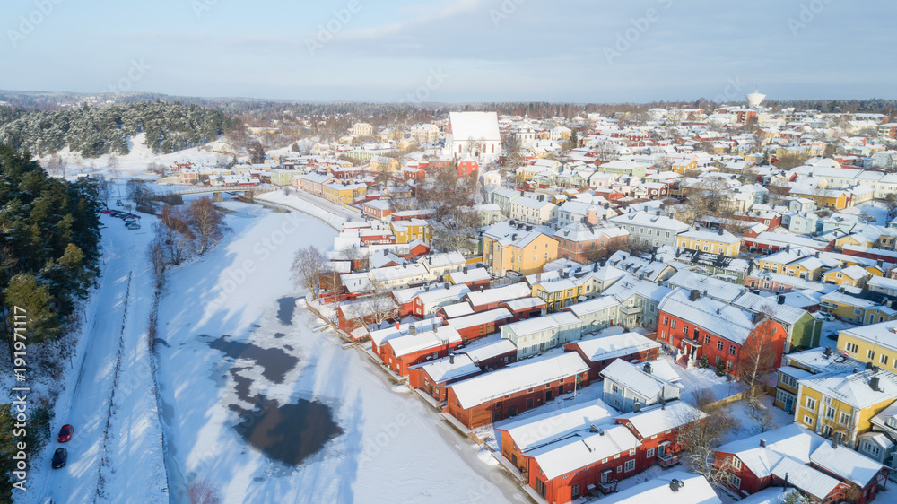 Aerial beautiful view of wooden red house and Porvoo old town near the river. Finland.
