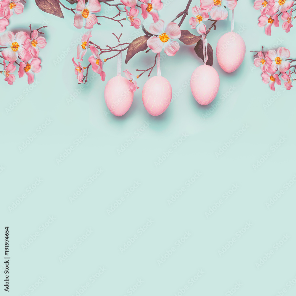 Easter layout with hanging pastel pink eggs and spring blossom at light at blue turquoise background. Copy space for greeting or invitation