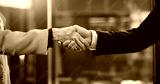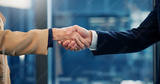 Corporate, people and greeting with handshake in office for meeting, welcome and investment deal. Team, shaking hands and introduction for partnership, agreement and negotiation for financial offer