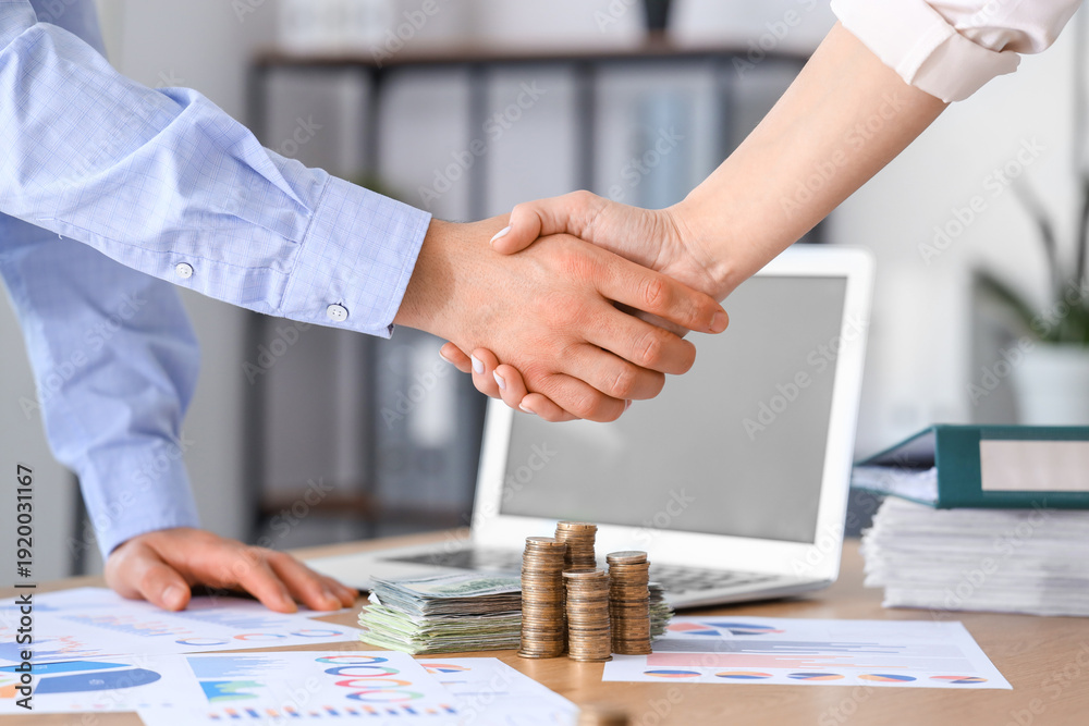 Business partners shaking hands in office, closeup