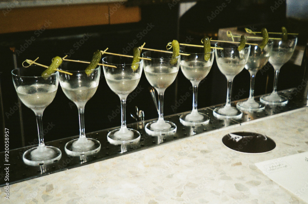 Row of martinis garnished with pickles on bar counter