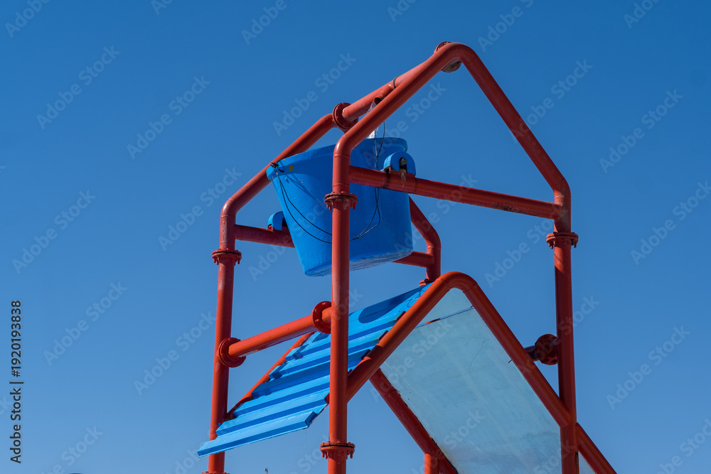 Boat control panel featuring throttle lever, steering wheel, and gauges overlooking calm ocean waters in a marine environment
