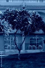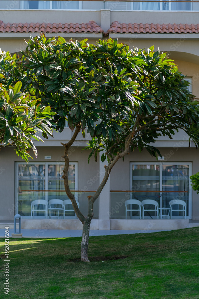 Green leafy tree in front of a modern building with large windows and white chairs on a well-maintained lawn