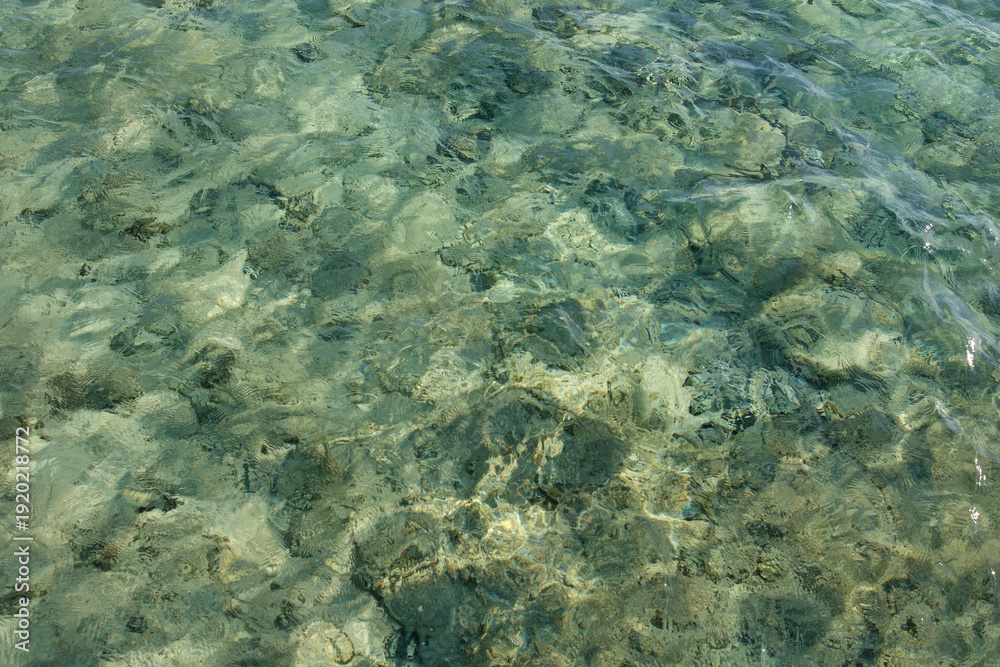 Clear turquoise water with visible coral formations and sandy bottom in a tropical marine environment