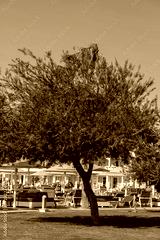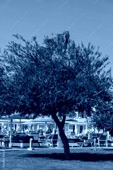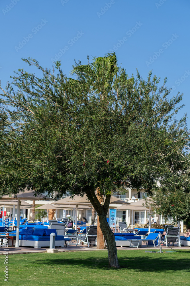 Green leafy tree with a palm frond in a sunny outdoor resort area, sun loungers and umbrellas visible in the background