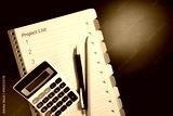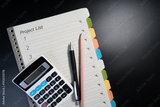 Blank business paper form project list, pencil, pen and calculator on black background. Close up of project list plan sheet notebook paper on black table for business.