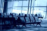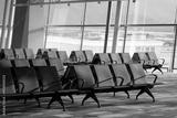 Sunlight streams across empty rows of orange and grey seats inside a modern airport departure lounge