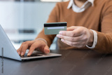 Person making an online payment, holding a credit card in one hand and typing on a laptop with the other, engaging in e-commerce and secure banking transactions from a modern office setting