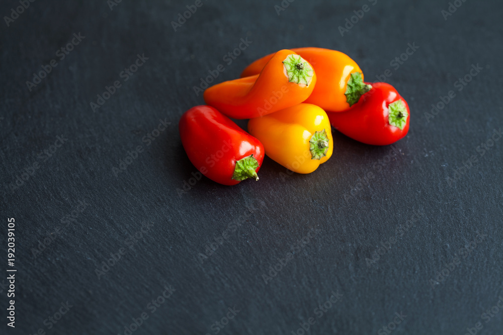 Tasty sweet bell peppers on black stone. Bright red yellow orange vegetables, copy space background
