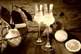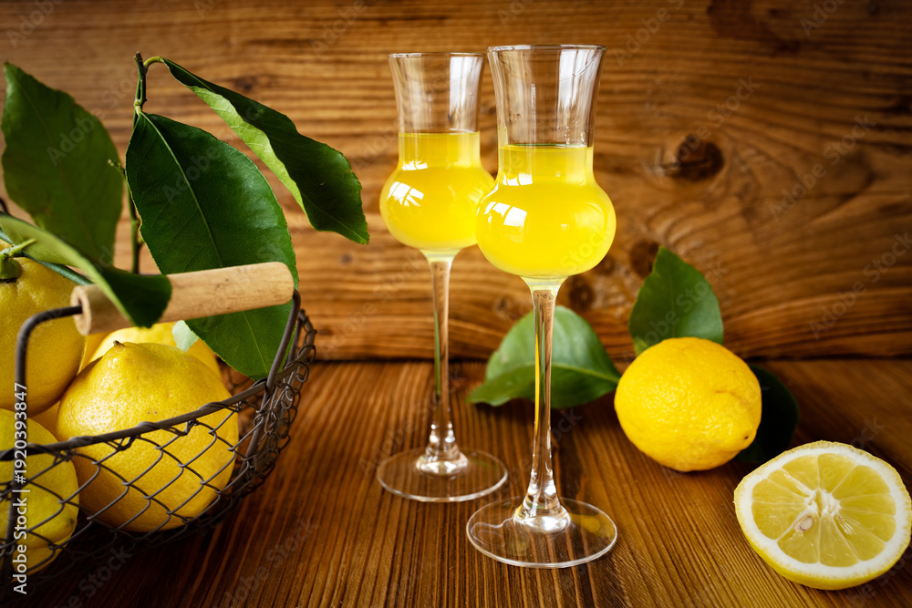Limoncello in two glasses with ripe lemons on a rustic wooden base. Italian liqueur.