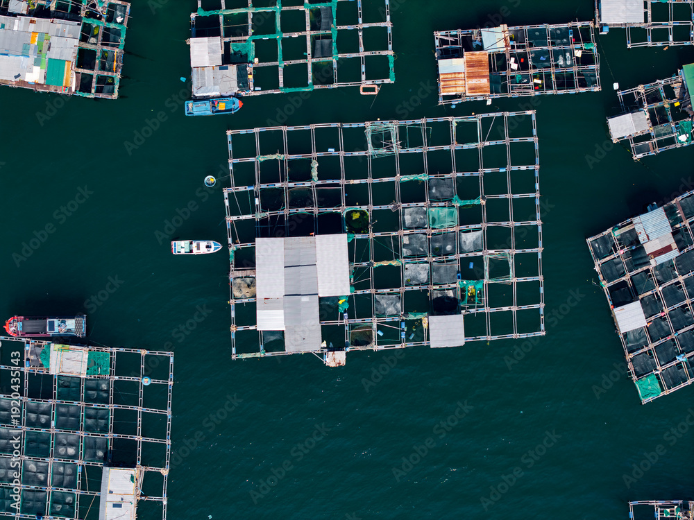 Aerial view of fish farm grid and floating platforms on water