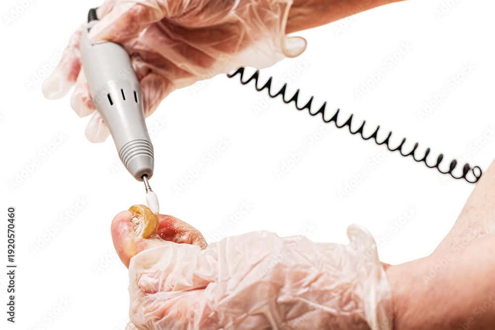 doctor treats onychogryphosis of nails using machine. Treatment of toenail fungus on a white background for medical illustration.