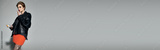Young beautiful woman showcases bold fashion in a striking urban setting during golden hour