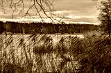 Beautiful morning landscape. Trees and plants at the lake at sunrise.