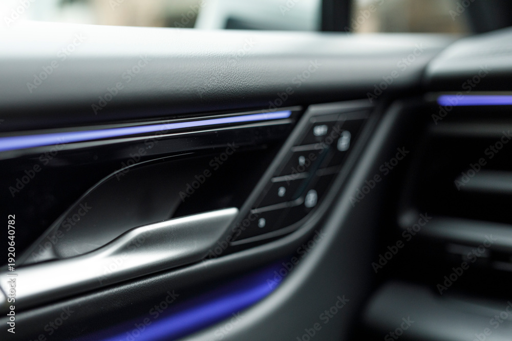 Close up of a modern car interior. Door handle and control panel with soft lighting. Stylish and clean automotive desi