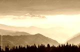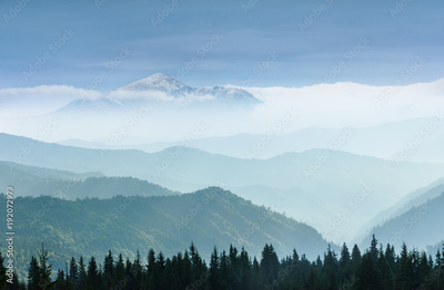 Majestic landscape of foggy mountains. A view of the misty tops of the mountains in the distance. Morning misty coniferous forest hills in fog and rays of sunlight. Travel background.