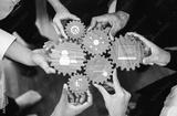 A dynamic scene showcasing hands working together around wooden gears, representing teamwork, technology, and innovation in a collaborative business setting. Amity