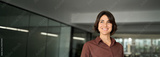 Happy young professional businesswoman manager, smiling confident female executive leader, woman entrepreneur or business owner looking away thinking of future in office at work. Portrait.