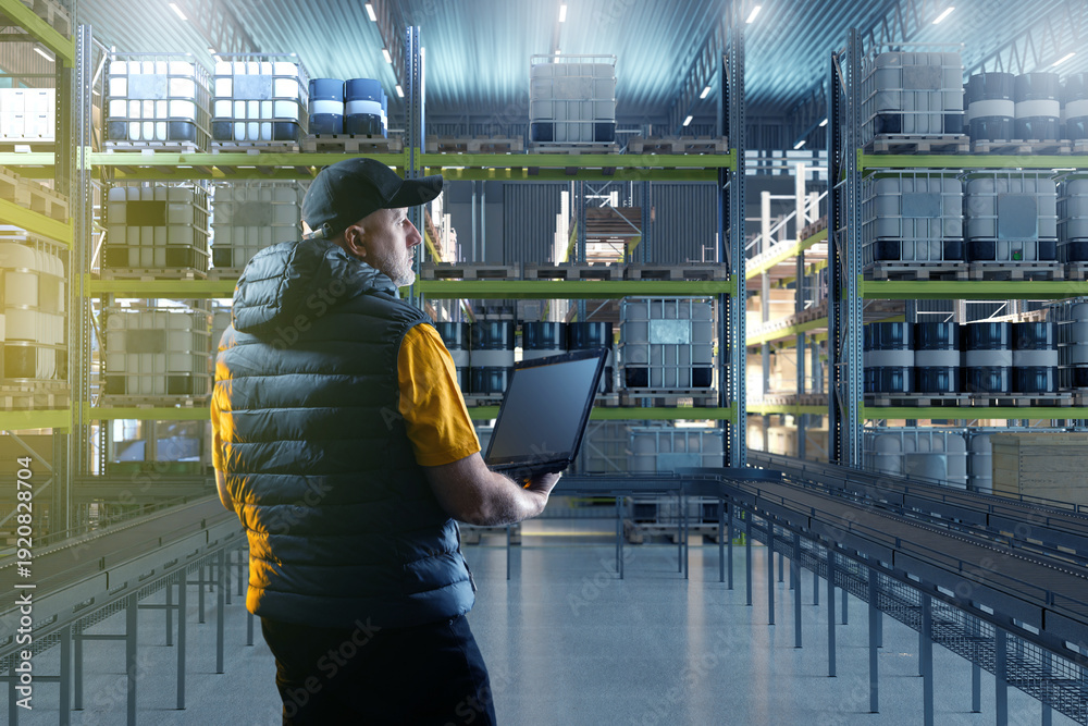 Logistics, Warehouse management. Worker with laptop monitors inventory and storage tanks on industrial shelving, overseeing stock control, distribution processes, and facility operations.