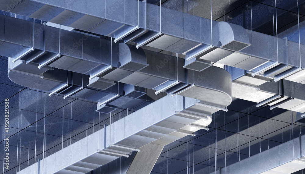 HVAC engineering, industrial ventilation ducts installed under ceiling for climate control in commercial building, air distribution system for heating, cooling and air circulation.