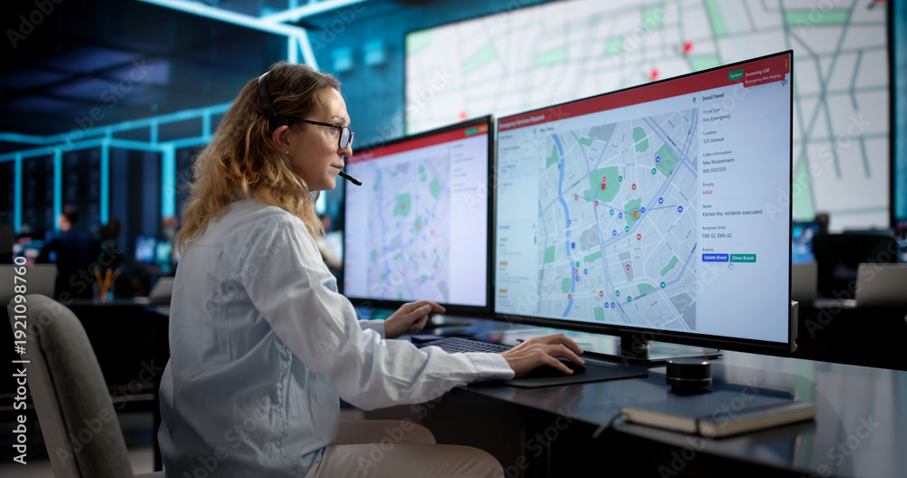 911 Emergency Services: Woman Using Headset To Dispatch Ambulance