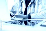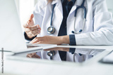 Telemedicine concept. Female doctor giving online consultation to patient via laptop computer at clinic office for domestic health treatment. remote medical appointment, telehealth
