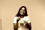 Young woman enjoying green smoothie with reusable straw on vibrant yellow background