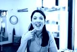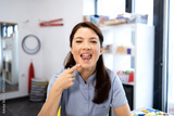 Speech pathologist showing open mouth and demonstrating articulation exercise, pointing to chin while performing a tongue movement for therapy in a clinic setting