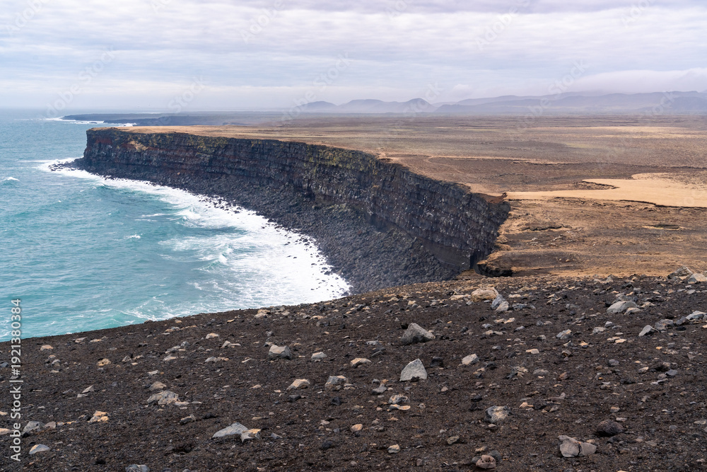 Aerial view of The Cliffs at Krysuvikurberg on the Reykjanes Peninsula in Iceland on a spring day.