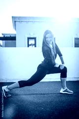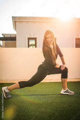 Young beautiful young woman in sportswear doing stretching while standing at rooftop during sunset. Girl doing front forward one leg step lunge exercise.