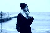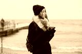 Young beautiful girl drinks coffee and looking at sea. Winter.