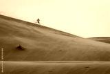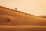 Man running joyfuly on dunes of desert Sahara in Morocco in a storm day