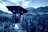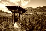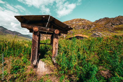 Wide-angle shooting of wooden shaft well in mountains surrounded by cannabis and fleabane native grasses with hill ridge and valley behind; view of abandoned dug well on a sunny summer day, Altai