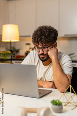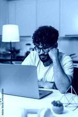 Arabian man at home ends remote laptop job feels bored tired stress burnout wants rest. Egyptian guy sitting at table rubs face sighs low energy looks aside plans pause from tasks tonight.